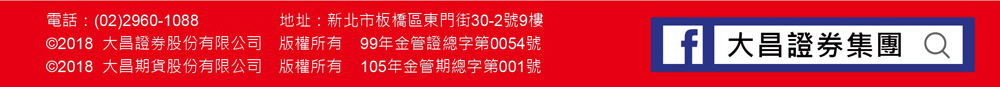 大昌證券公司於民國 78 年成立,至今已有6家服務據點及證券、期貨、複委託線上開戶、PC版及手機APP的電子交易服務。